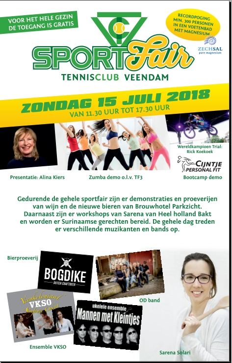 Het wordt een nogal afwisselende dag waar echt vanalles te beleven is. Zo kunnen gasten proeven van het Bogdike Bier, zijn er allerlei sportieve sportpresentaties. Niet alleen tennis, maar ook biketrail bijvoorbeeld. Verder komt keukenprinses Sarena Solari langs. De winnares van Heel Holland Bakt geeft een kookworkshop. Ook geeft het Veenkoloniaal Symfonie Orkest een optreden en zorgt actrice Alina Kiers voor de nodig reuring. Het wordt, kortom, een volle en gezellige dag bij TC Veendam.